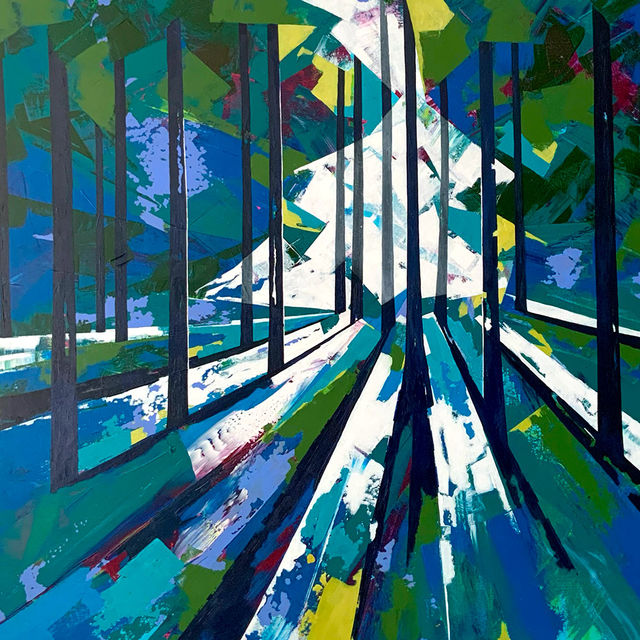 My stylised bluebells, painted with a credit card are a classic of mine. Painted in all sizes and palettes, it is always a popular choice. There is something very romantic about a woodland filled with bluebells but I have tried to make my version more edgy with some added drama.